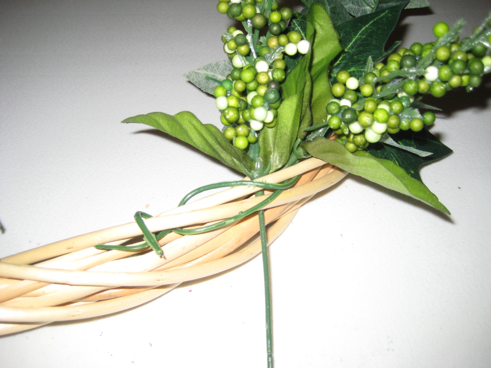 I started by weaving the long stem of each leaf group into the actual wreath base (no glue needed). I randomly distributed the leaves and made a few areas with thicker foliage. Once all the dark green leaves were added, I started weaving in the flowers (see close up below of how I bent the stems around the branches of the wreath).