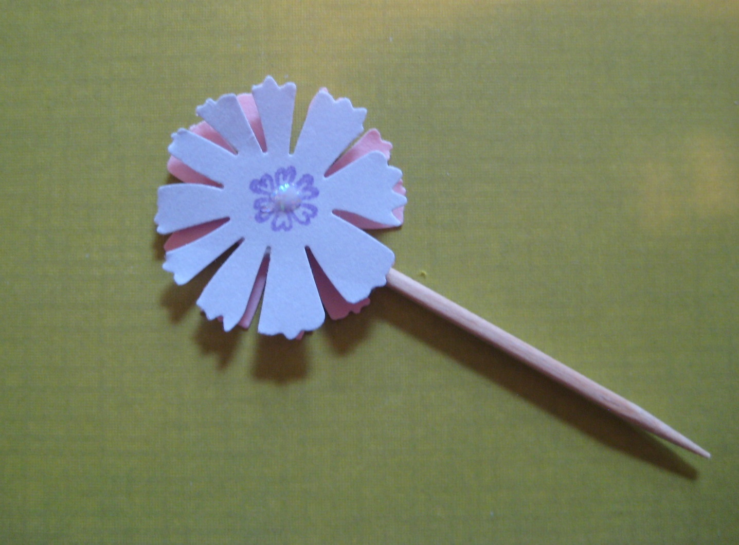 To assemble the topper, you will need 2 flowers, a tooth pick, and